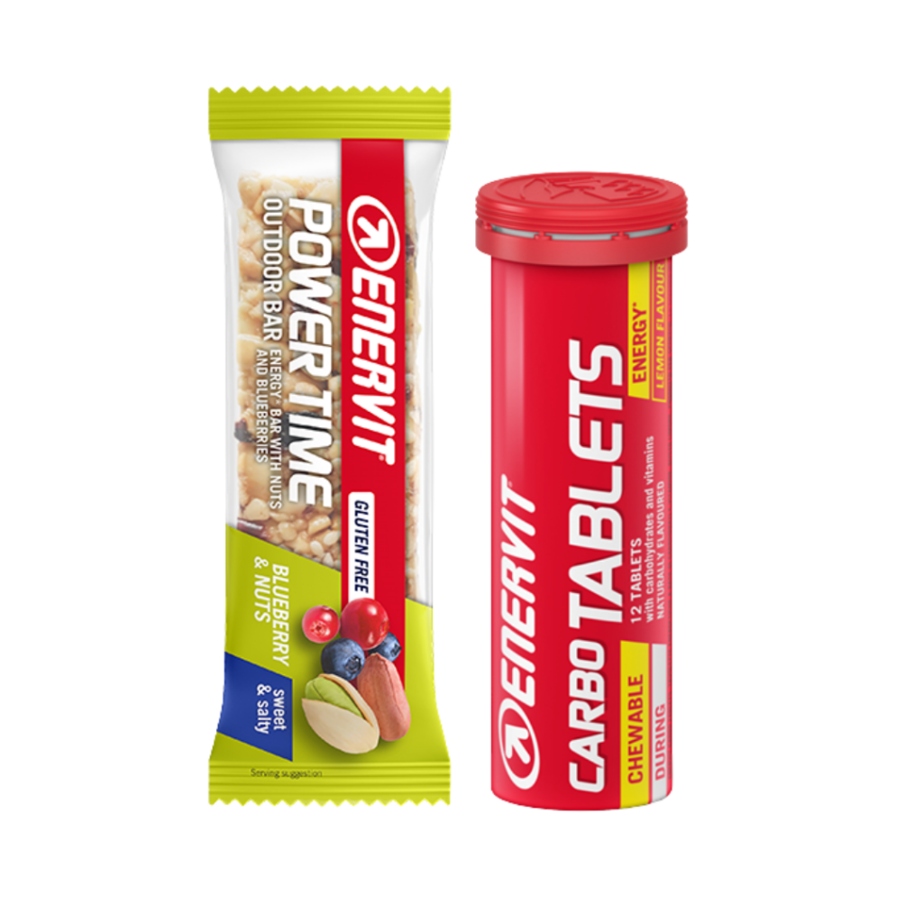 Consume Power Time Sweet & Salty energy bar and, depending on how you feel, 1–2 energy tablets.