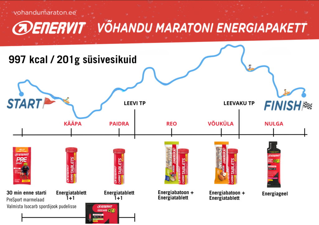 One of the unique features of Võhandu Marathon is that the course includes several clear landmarks — many of them bridges that athletes know well. These make it easy to plan your energy intake. The plan below helps you maintain stable energy throughout the course, without unnecessary rushing or forgetting.